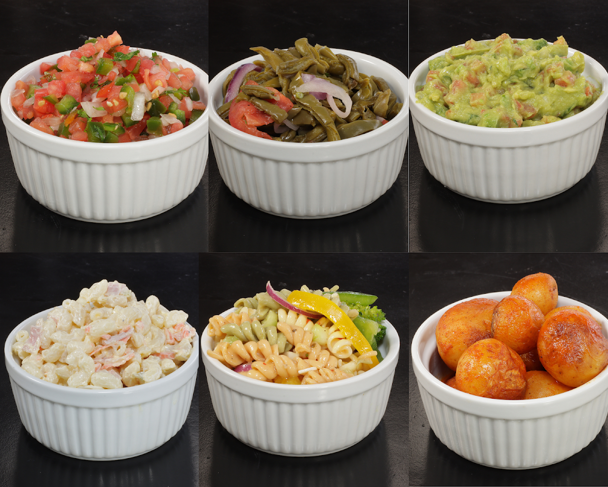 Pico de Gallo, Cactus salad, guacamole, Mexican macaroni salad, Cole salad, three colored pasta salad.